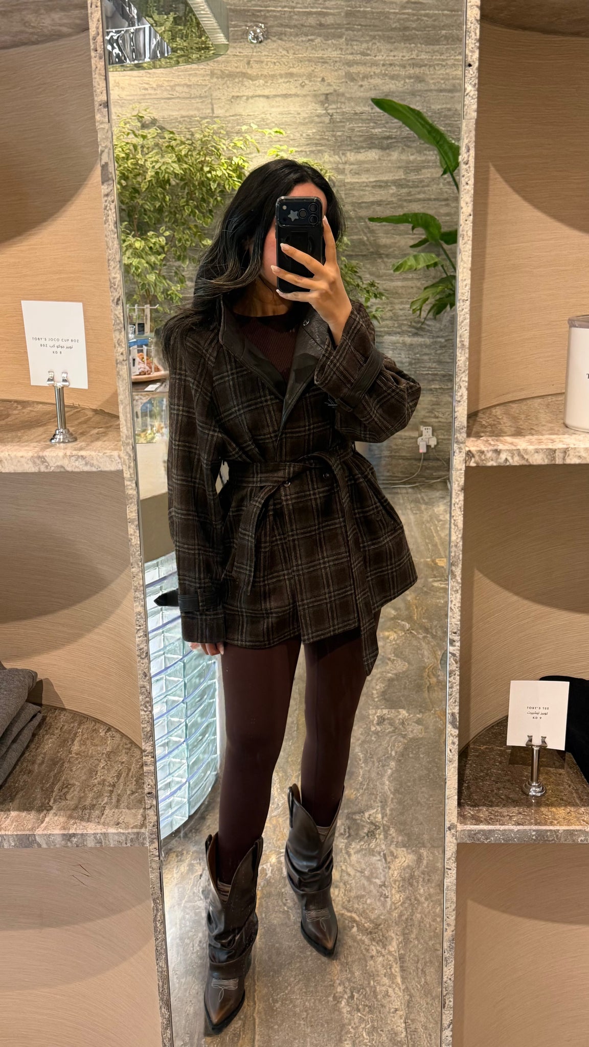 plaid winter jacket with leather details